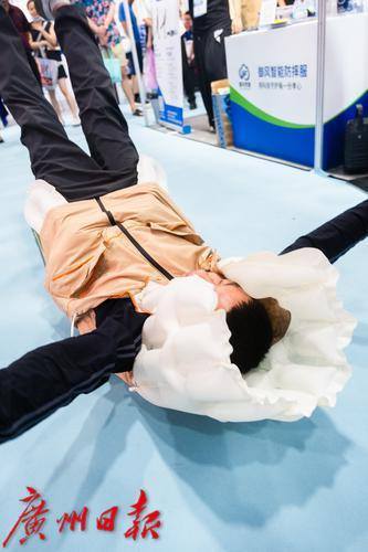 工作人员展示身穿一款智能防摔服倒下,防摔服及时弹出气囊保护身体。