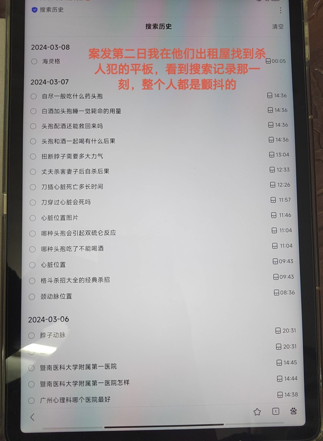 小陈的妹妹陈女士的证词显示,姐姐被害后,家人到她和杨某某居住的房间收拾物品时,发现一台小米平台电脑,该平板的百度应用搜索历史里,有一些关于“丈夫杀害妻子后自杀后果”“刀穿过心脏会死吗”等记录,还有咨询精神病医生关于“精神失常的人犯法需要承担责任吗”的记录,这些应该是杨某某在杀害姐姐前搜索的。陈女士的证词称,姐姐没说过杨某某一句坏话,但是过年期间和她说过有离婚的想法,讨论怎么去做,还告诉她,领结婚证前一天,杨某某威胁如果不领证,就杀她全家。此外,还有一次两人发生矛盾,杨某某曾拿刀威胁她。