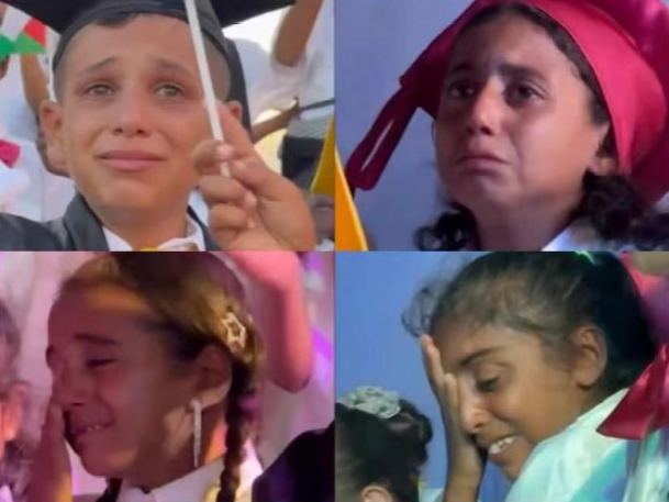 ▏18日,加沙南部一所孤儿学校为1000多名巴勒斯坦孤儿举行毕业典礼。头戴学士帽、身着毕业服的孩子掩面哭泣