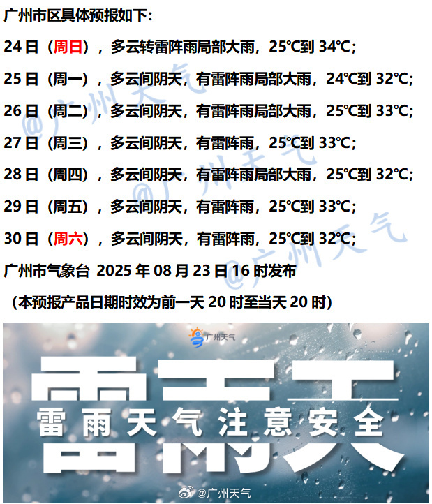 广州市气象台预计,受“剑鱼”外围环流影响,8月24日夜间—25日广州有雷阵雨局部大雨,广州港区阵风维持6~7级。8月26日—28日广州以多云为主,间中有雷阵雨。