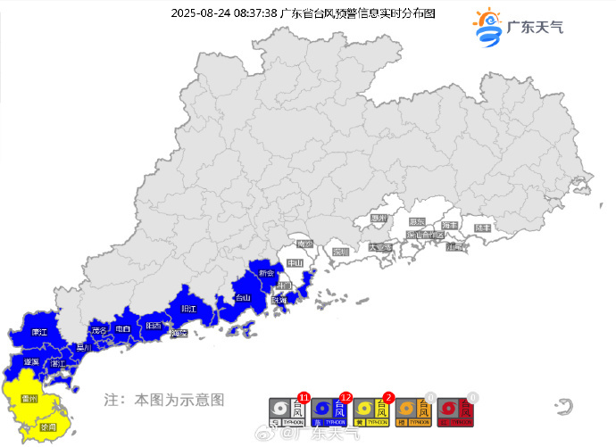 截至8:37,广东徐闻、雷州台风黄色预警生效,湛江、阳江、珠海等12个市县台风蓝色预警生效,南沙、深圳、汕尾等11个市县台风白色预警生效,请密切关注台风动态,并及时做好防御。