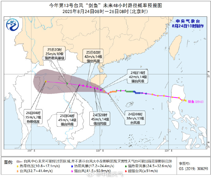 海南省政府2025年08月24日09时40分提升台风二级预警为台风一级预警:台风“剑鱼”(台风级),09时中心位于北纬17.3度、东经111.1度,也就是在离三亚市东偏南方向约200公里的南海海面上,中心附近最大风力有13级(38米/秒),七级风圈半径200~220公里,十级风圈半径80公里,十二级风圈半径40公里。