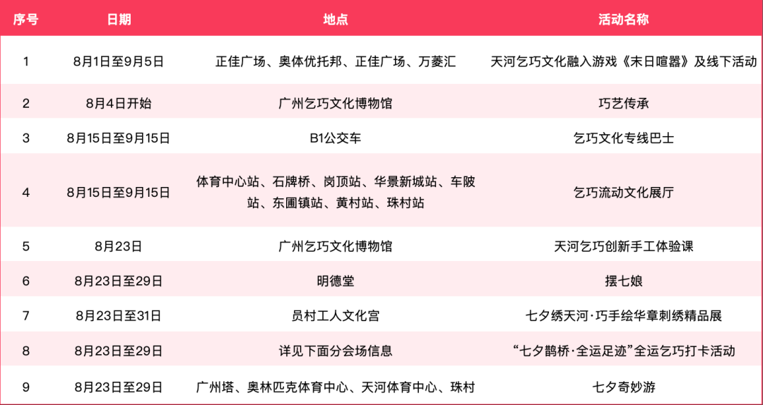 在“七夕鹊桥・全运足迹”全运乞巧打卡活动中,BRT天河体育中心站、奥林匹克体育中心(奥体优托邦店)、正佳广场、员村工人文化宫、广州乞巧文化博物馆、天河拾光里、珠村七夕广场7个分会场化身“文化+体育”体验站。