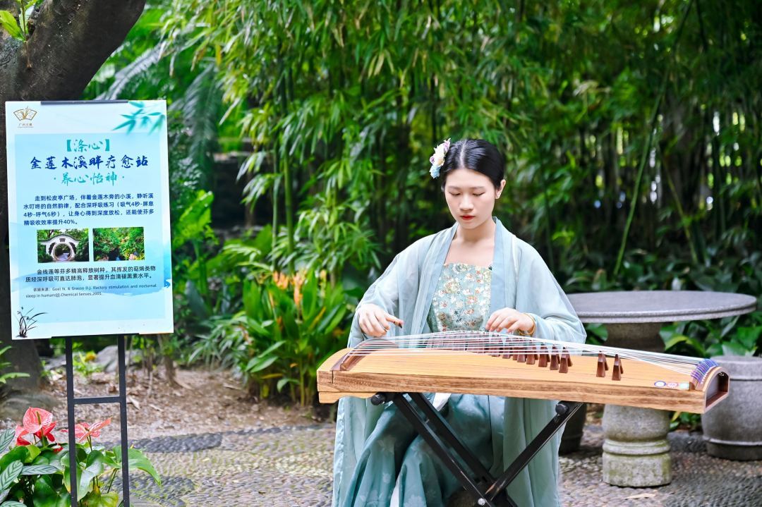 据介绍,8月“兰叙”开业首月的每个周末,兰圃路亭将华丽化身为“宋韵非遗手作市集”,开启一场穿越古今的沉浸式文化雅集。在这里,人们可以亲手体验广绣的细腻、陶艺的拙朴、剪纸的精巧,细品特色兰香茶点,在雅致中领略宋代生活美学。市集还特设“妙趣画像铺”,公众可与亲朋好友定制专属卡通肖像,用艺术妙笔定格欢乐时光。活动更有清音民乐串联起兰叙店、路亭、松皮亭的景致,古琴、琵琶演奏与自然声景融合,构建类似白噪声(白噪声指的就是一种包含了人耳可听到的声音频谱上的所有频率的噪声)的听觉疗愈环境,通过触感和听感的双重疗愈,可有效降低皮质醇水平,缓解焦虑情绪。