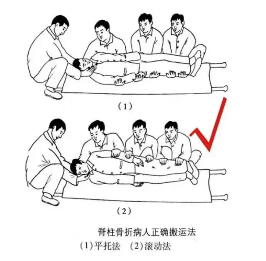 最后,等待专业医护人员用颈托和脊柱板固定后转运。