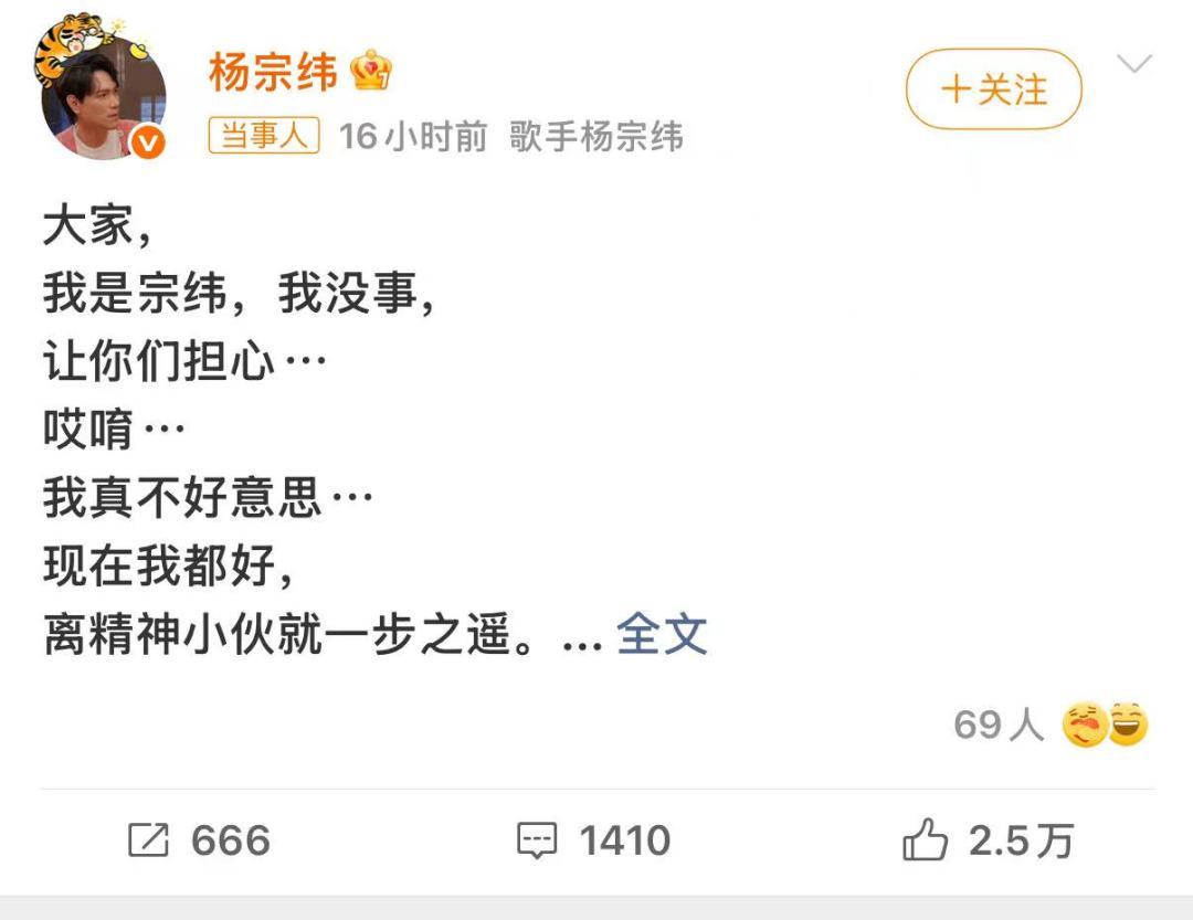 今天凌晨,杨宗纬本人通过微博向粉丝报平安:“我是宗纬,我没事,让你们担心...哎唷...我真不好意思...现在我都好,离精神小伙就一步之遥。”