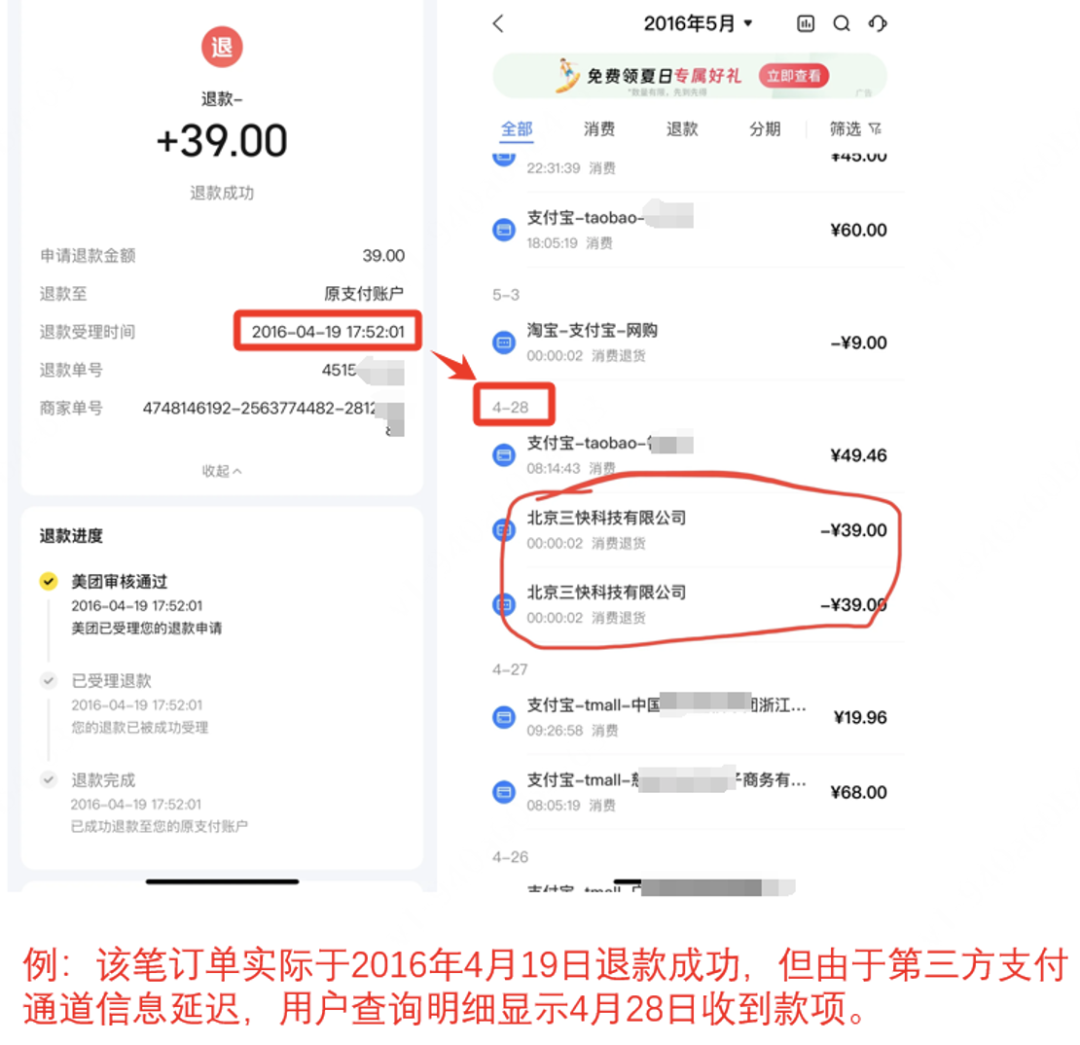 “如果用户收到‘退款成功’通知,资金肯定已经回到了用户账户上。”美团客服表示,并不存在“不查询就不退款”“删除订单”等现象。