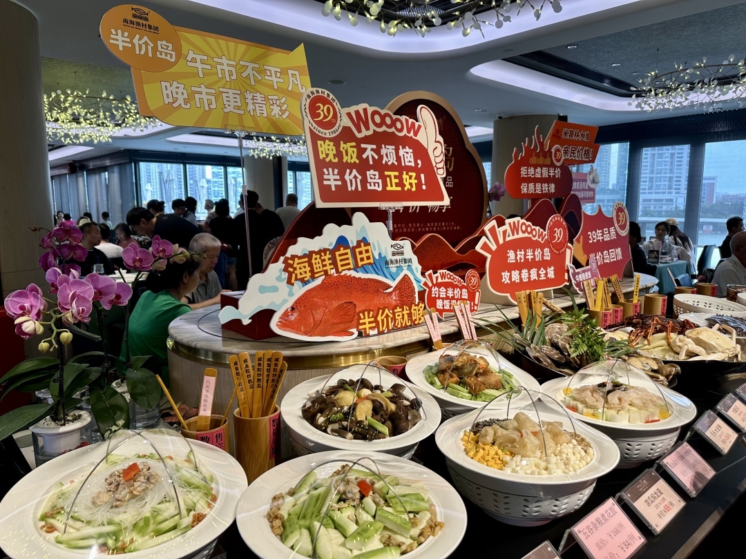午市未启,这家餐厅的后厨已然一片“抢鲜”光景。海鲜区贴着醒目的“半价”标签,每天15款海鲜菜肴轮流半价优惠。每道菜旁都放着竹筒,其中插着竹签,选中哪道菜,取其竹签即可。“开渔季是暑假餐饮的‘黄金窗口’,消费者对‘鲜’有极强的心理预期,认为其口感更佳,从而增加了消费频次。家庭聚餐订单明显上升。”南海渔村有关负责人称。