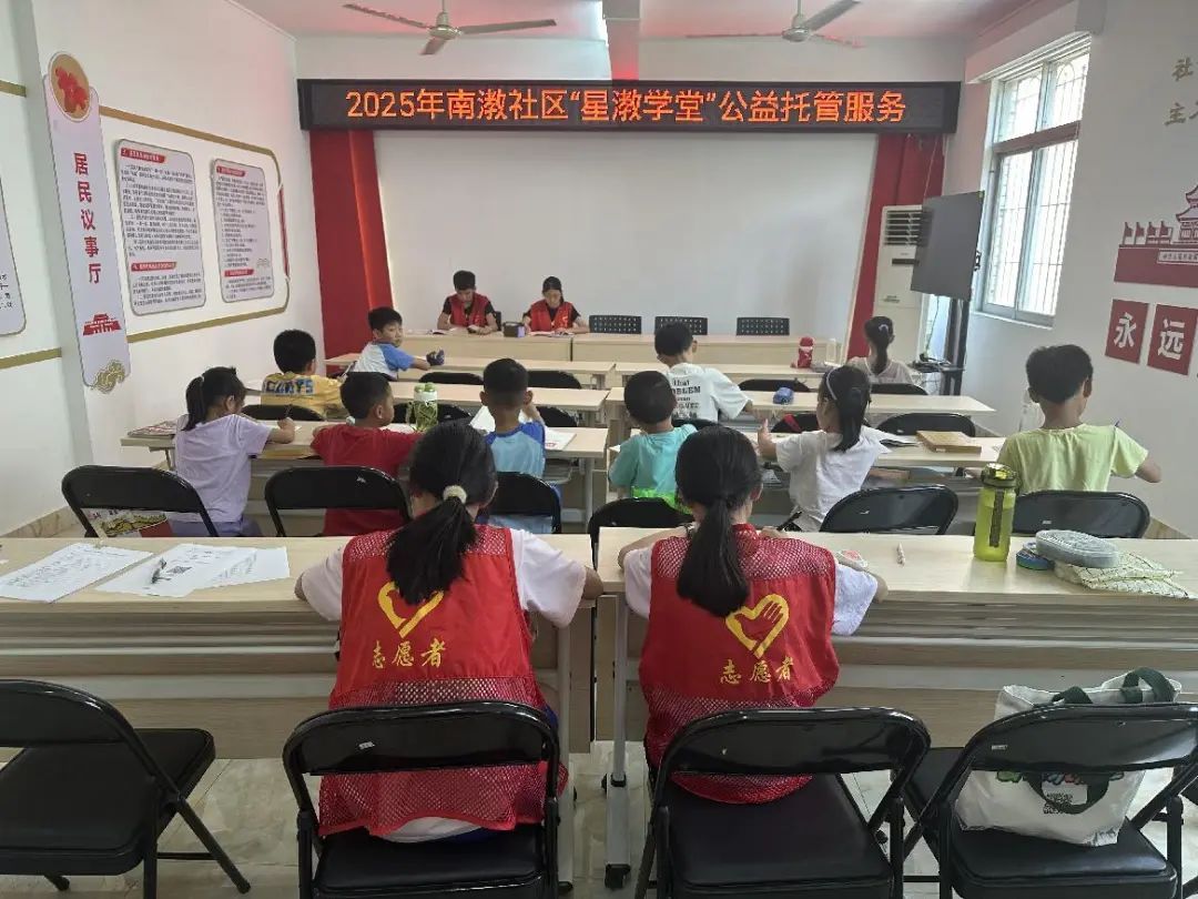 针对辖区新就业群体、双职工家庭“看护难”的痛点,社区依托党群服务阵地,探索设立党建品牌“星漖学堂”公益托管服务。整合社工、大学生、志愿者力量,在暑假期间以新就业群体子女、双职工家庭子女、候鸟儿童为服务重点,探索“托”“管”“教”有机结合的公益性托管模式,为未成年人提供阅读指导、文体活动、综合实践、兴趣拓展等服务,让儿童在寒暑假有“趣”处。