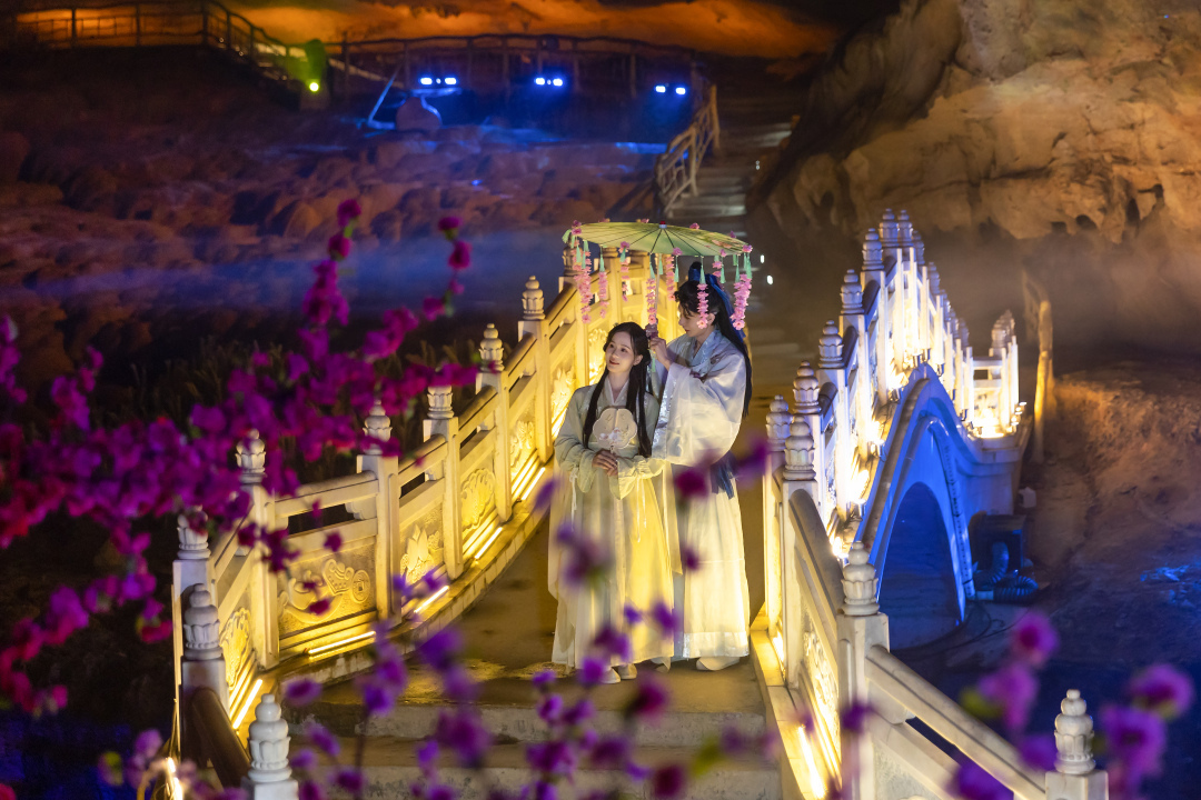 七夕之际,少不了鹊桥相会。其中,位于粤北的连州地下河景区将连接地下河的一条石桥成为网红。连州地下河这座桥原为连接河两岸的桥,是一座地下溶洞的桥,用汉白玉石头建成。景区将桥改成一条现实版的鹊桥。穿过地下河曲径通幽的进洞栈道,来到鹊桥边,可以看到浪漫场景:灯火迷离,桃红醉人,拱桥如虹,喜鹊展翅,如同民间传说的鹊桥一样,充满了温馨气氛。