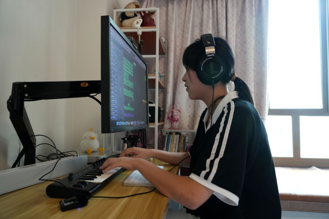 “初二时,我偶尔刷到一个编曲的视频,它把生活中的常见声音,比如敲罐子、拍手声等,组合起来编成了一首好听的音乐。我当时觉得很神奇,自己也想试一下。”从此,王艺颖开始自学编曲,尝试用音乐表达自己的情感。