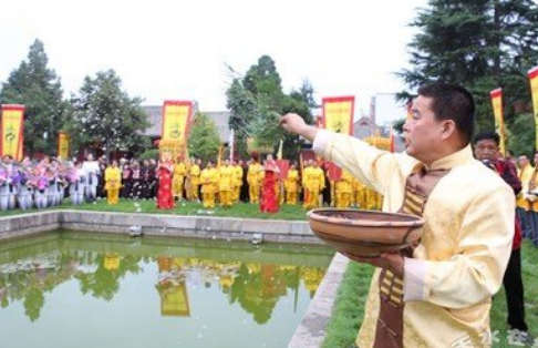 客家长者身着传统服饰,用竹叶蘸取“七夕玉露水”洒向游客,寓意吉祥。