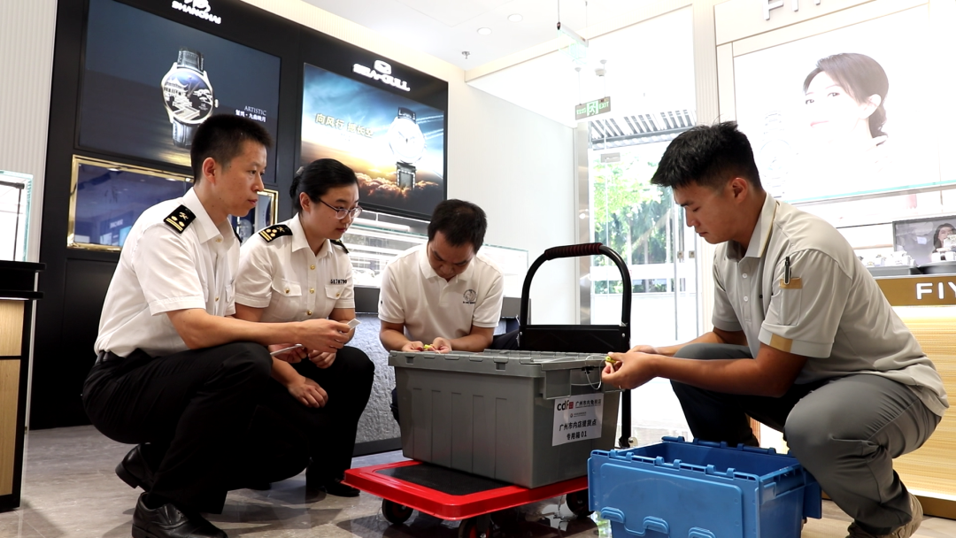 广州海关所属天河海关关员监督市内免税店工作人员将旅客购买的免税品放入指定的配送箱中。