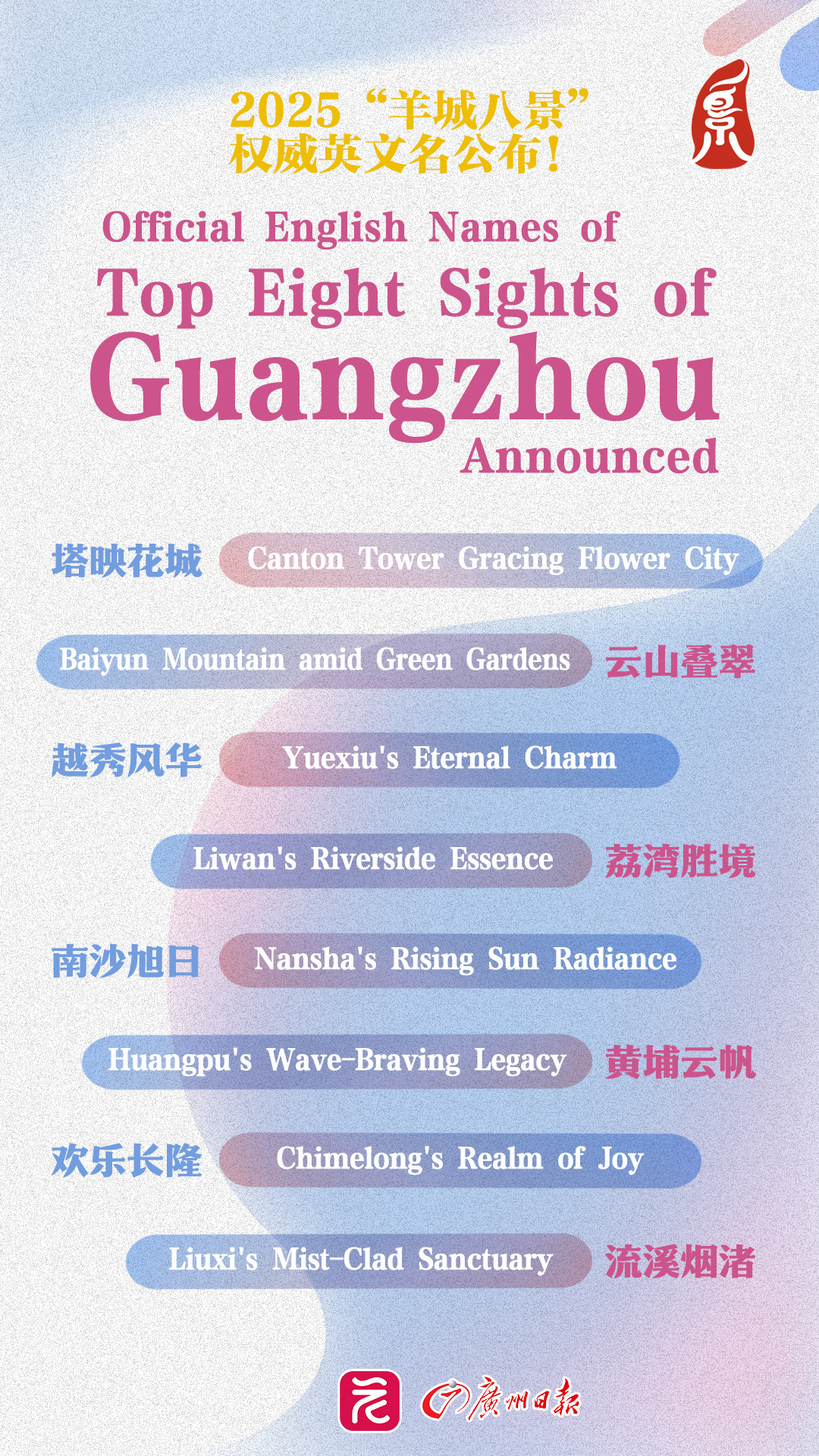 2025年“羊城八景”于8月3日晚正式揭晓,让这个千年IP再次焕发风采。为了向全球推介最新版“羊城八景”,赋能广州国际城市形象塑造,广州日报国际传播中心征询专业人士意见,历时三周,现推出较为权威的“羊城八景”英文译名,作为国际传播时的参考译名: