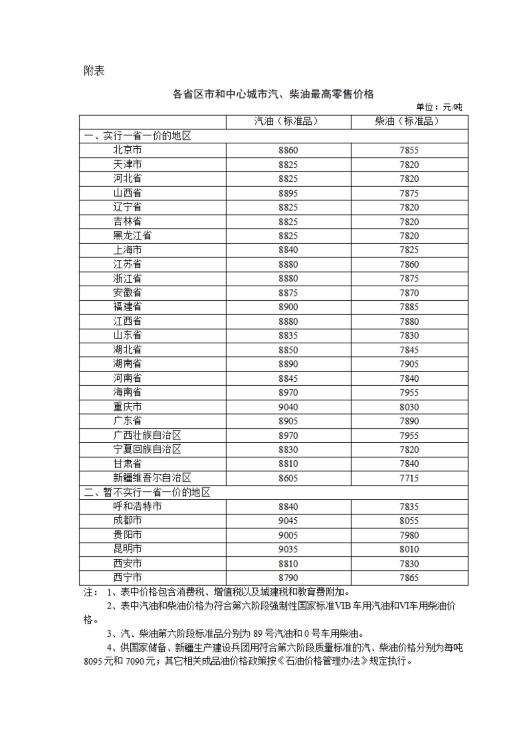 调整后,各省(区、市)和中心城市汽、柴油最高零售价格见附表。