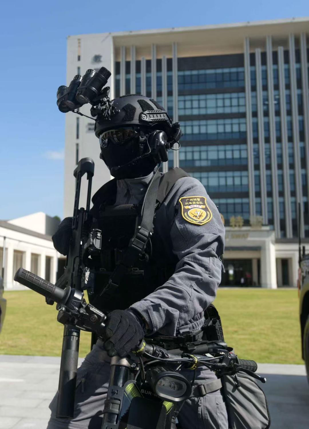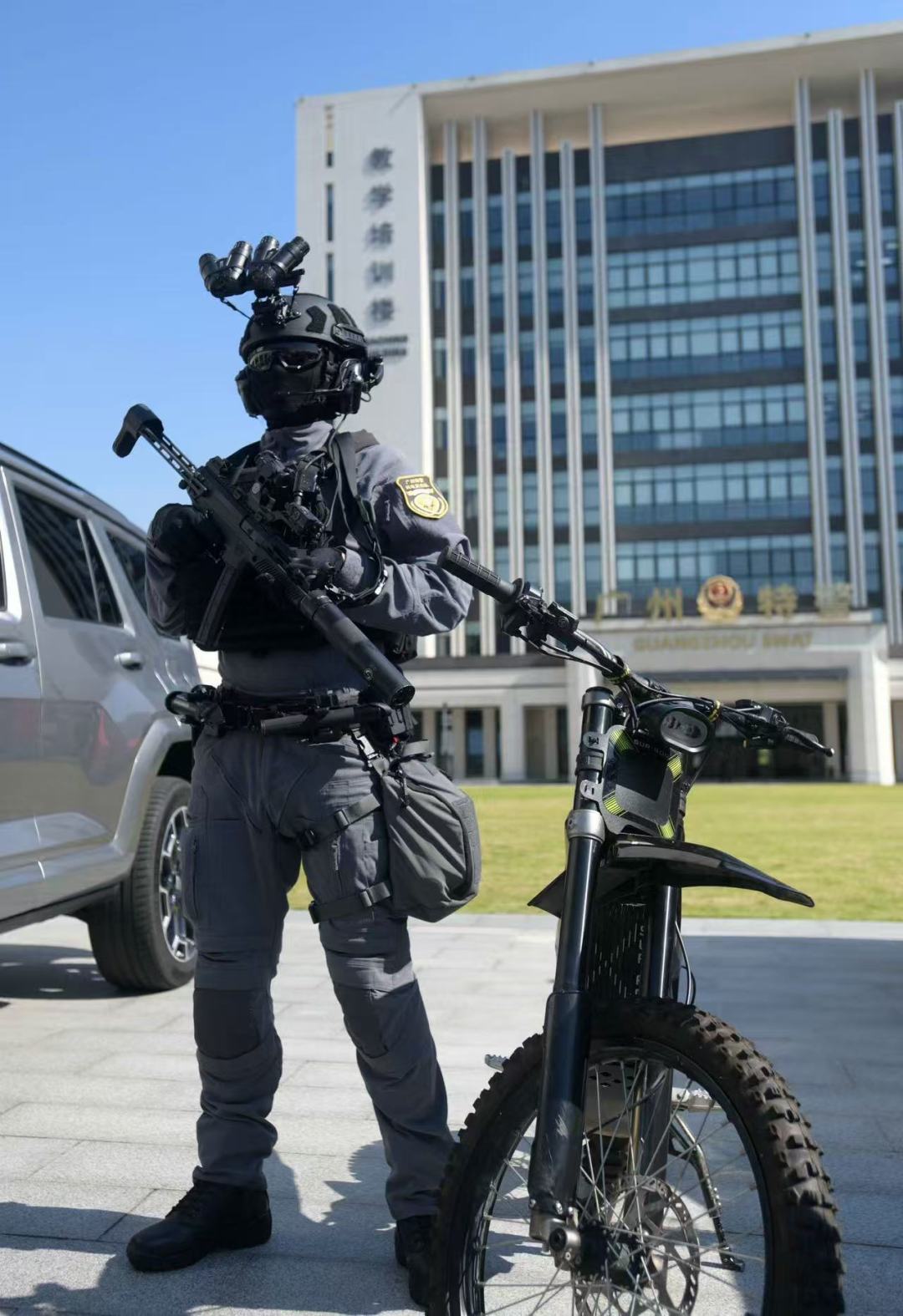 “这套装备可以用来应对持枪嫌疑人,或有人质劫持的情况。突击手佩戴双目四通夜视仪,视场角是原先装备的两倍宽,”广州市公安局特警支队一大队民警郭警官介绍,配备的我国国产新一代冲锋枪,配合空间弹的使用,可以在室内战斗时减少因过度穿透以及跳弹造成的意外伤害,且具有更好的停止力。“在枪上,我们还加装了新型红点瞄准镜以及多功能武器灯,虬龙电动越野摩托车重量只有约50公斤,便于队员在到达处置地点后,快速部署狙击小组,或在山林环境中进行追捕、侦察。”