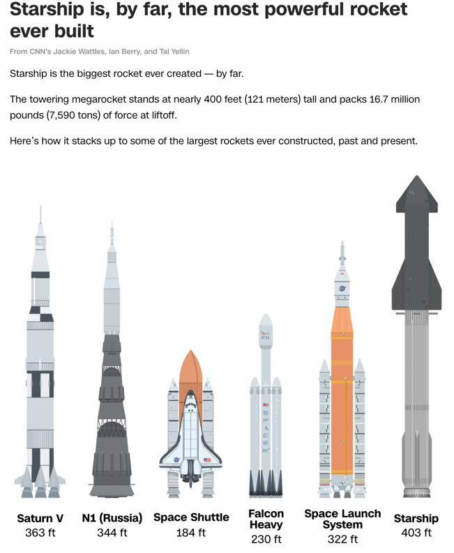 作为史上推力最大的运载火箭,“星舰”高达123米,比美国此前载人登月使用的“土星五号”火箭更大。