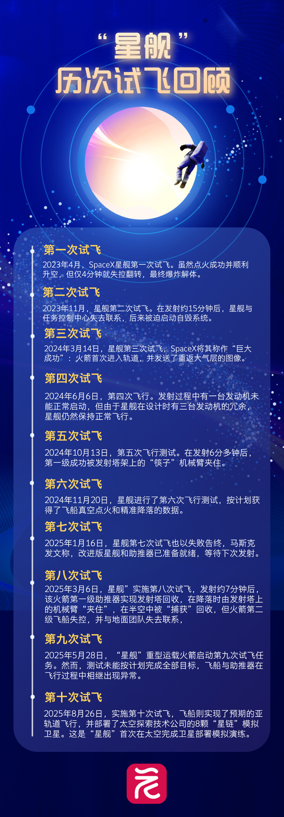 此前,“星舰”原计划8月24日从位于美国得克萨斯州南部的基地发射,但发射前宣布因地面系统故障取消。25日,“星舰”第十次试飞在倒计时40秒时,因天气原因再次取消了试飞尝试。
