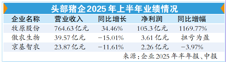 据牧原股份2025年半年报披露,上半年,该公司实现营业收入764.63亿元,同比增长34.46%;实现归母净利润105.3亿元,同比增长1169.77%。此外,牧原股份宣布,将进一步支持行业产能调控政策,今年末能繁母猪存栏数量将减少至330万头。