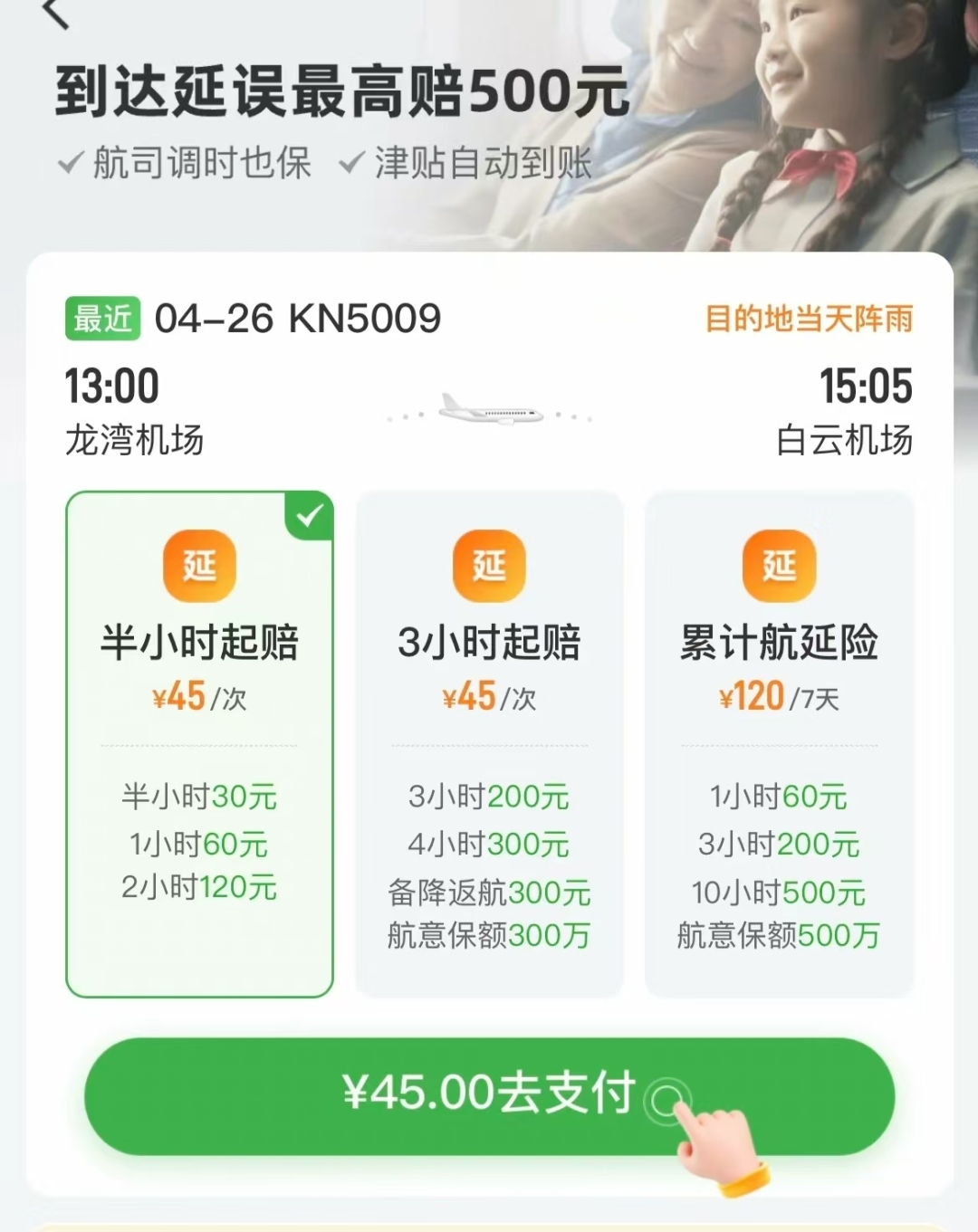 当前不少主流的在售航班延误险最低赔付门槛为航班到达延误时长≥30分钟,最少延误半小时起赔。比如一款半小时起赔的航班延误险,购买费用为45元,延误半小时赔付30元,1小时60元,2小时120元。关于航班延误险,起赔时间门槛较高、赔付要求严格、赔付款项到账慢等是不少消费者“吐槽”的焦点。