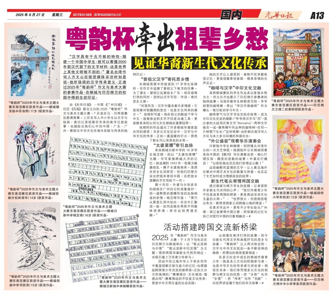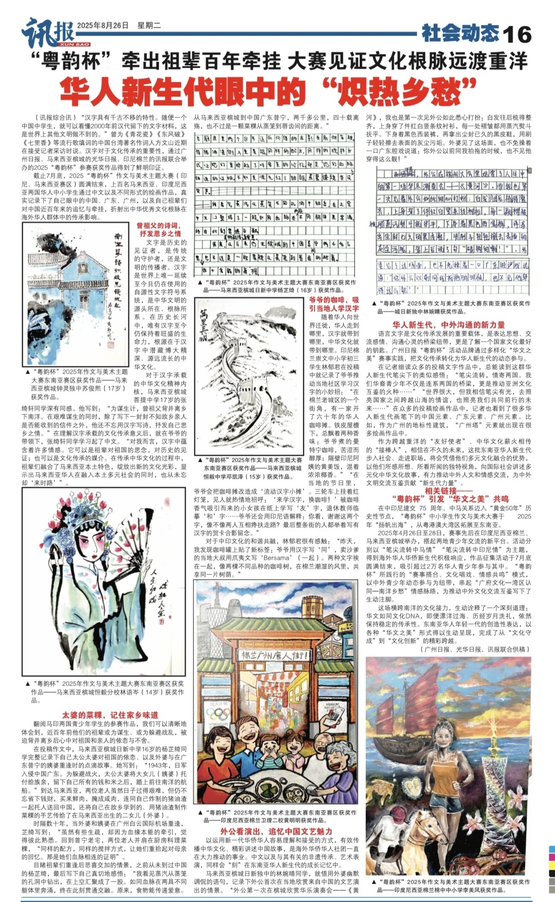 通过梳理2025“粤韵杯”作文与美术主题大赛(印尼、马来西亚赛区)大量投稿作品,8月25日至27日一连三天,《广州日报》《讯报》《光华日报》三家主流华文媒体通过较大篇幅刊发其中的代表作,作品所蕴含的“华文之美”以及“祖辈追忆”引发网友广泛共鸣。