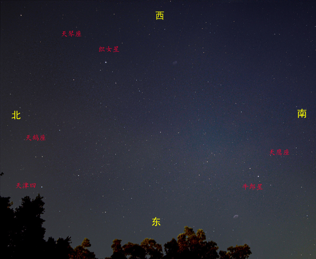 在广州,8月29日18时47分日落,日落40分钟后就观看到夏季大三角。大家可以先寻找织女星,找到织女星后,就很容易看到牛郎星和天津四。