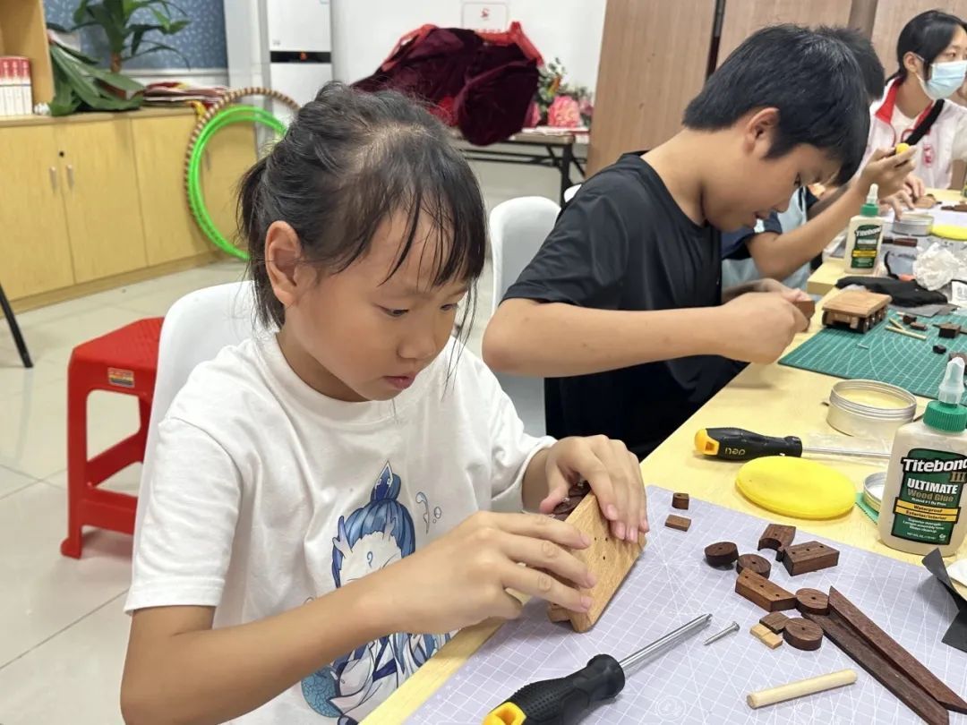 随后的木工实践环节,在社工的耐心指导下,孩子们动手体验传统木艺的魅力。他们将小木料反复细致打磨,使原木表面呈现出丝绸般的光泽,经过上油养护,最终拼合成一个个生动有趣的木作模型。整个过程中,他们不仅锻炼了动手能力和耐心,更感受到匠心传承的成就与喜悦。