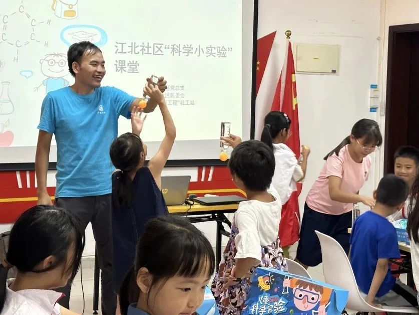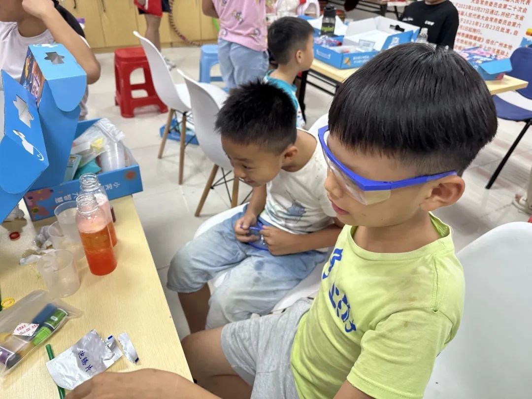 在最后一节别开生面的“实验室进课堂”活动中,社工带来了“调色大师”“液体分层”“水吸乒乓球”等一系列精心设计的科学实验。孩子们不仅探索了颜色混合的奇妙规律,还亲眼见证了“火山爆发”和“彩虹雨”的壮观场景,阵阵惊呼声中满是发现与兴奋。