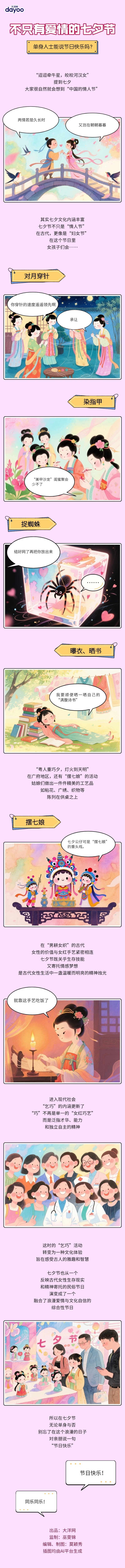 进入现代社会,“乞巧”的内涵更新了,“巧”不再是单一的“女红巧艺”,而是泛指才华、能力和独立自主的精神。这时的“乞巧”活动转变为一种文化体验,旨在感受古人的雅趣和智慧。七夕节也演变成了一个融合了浪漫爱情与文化自信的综合性节日。所以无论单身与否,别忘了在这个浪漫的日子,对亲朋说一句“节日快乐”!
