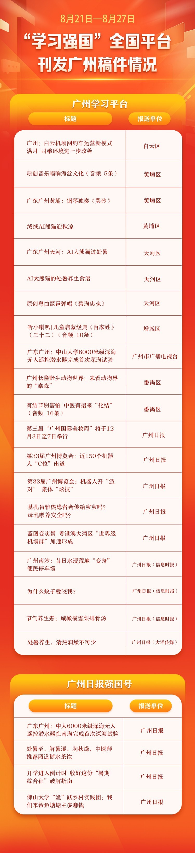 8月21日—8月27日,“学习强国”广州学习平台共有48条稿件(含音频)被全国平台选用,广州日报强国号共有4条稿件被全国平台选用。