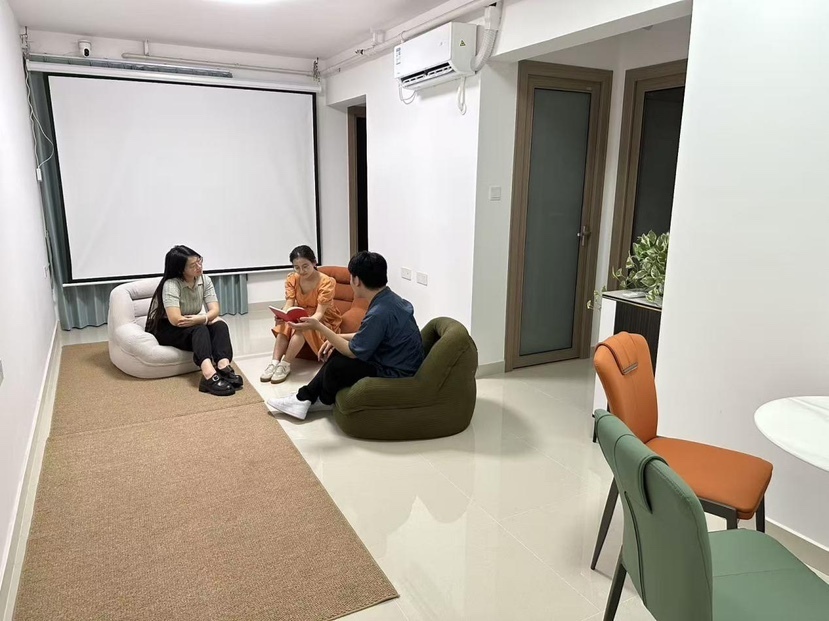 与青年人才座谈交流刚刚揭牌的共享空间,是番禺区万博人才公寓内集休闲社交、学习交流、创业讨论于一体的复合型场所。影音区、灵活工位、阅读区、健身角等一应俱全。“平时下班后可以来这看书、开会,周末还有电影放映沙龙、桌游party、手工DIY等等”北京大学硕士毕业生龙德洋同学说,“它不像一个冰冷的公共设施,更像是我们这群人的‘线下朋友圈’。”