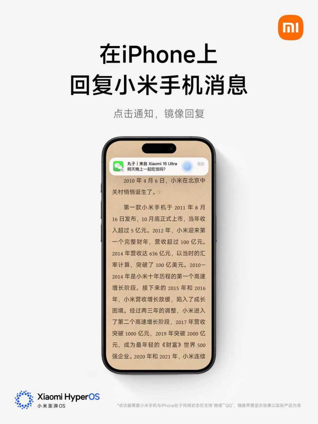 与此同时,跨端互联能力也得到了进一步提升,小米澎湃OS 3实现了小米人车家全生态全面支持苹果设备,在iPhone、iPad、Mac上安装“小米互联服务”后,即可实现小米手机和苹果生态设备之间的跨端协同能力。也就是小米手机的通知可轻松流转至iPhone,并通过iPhone镜像回复微信信息,在iPad、Mac上还能使用妙享桌面,可查看和操控小米手机,实现苹果设备和小米生态的操作打通。