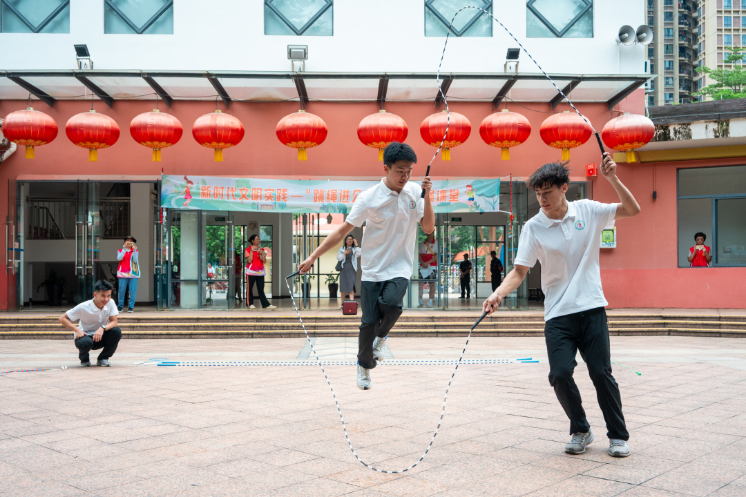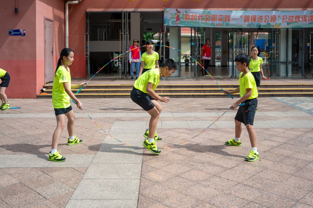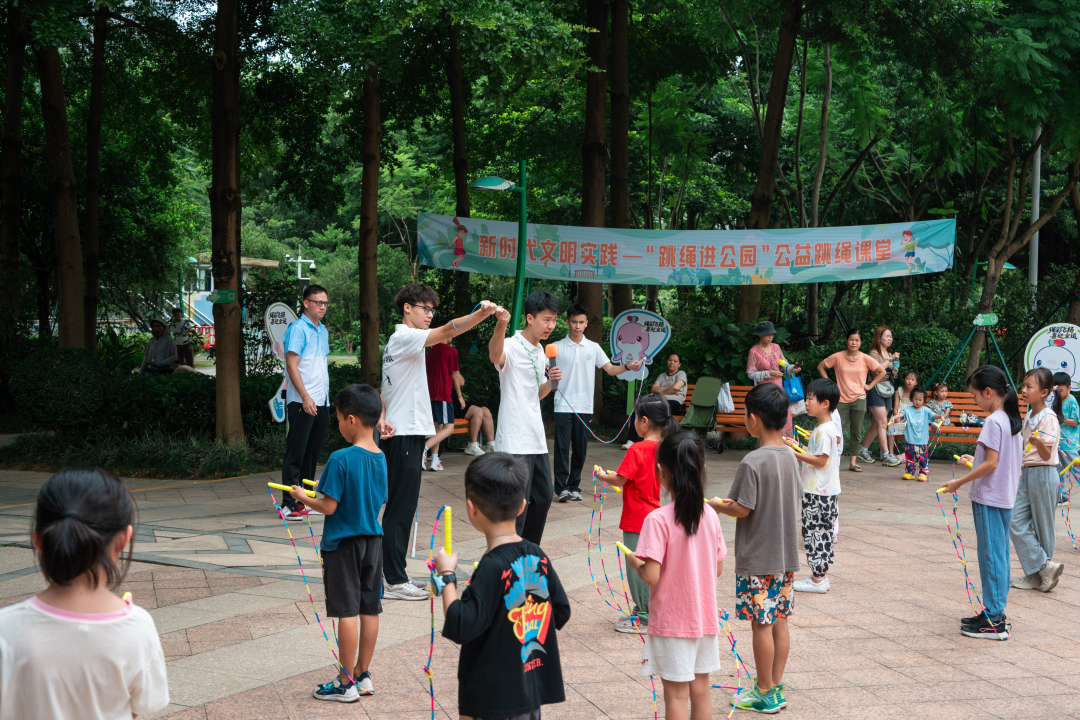 活动当天,来自广州市黄埔区东荟花园小学云荟跳绳队的队员们展示精彩的花样跳绳表演,钟炜锋、钟鹏、张敬威等跳绳世界冠军也在现场演示专业技艺。世界冠军钟炜锋完成一组30秒双摇跳,飞速的绳在空中划出银色弧线,引得孩子们连连惊呼。看着孩子们亮亮的眼睛,钟炜锋对记者坦言:“公园的树影和蝉鸣比体育馆更让人放松,孩子们在这里学跳绳,能更早明白运动本该是生活的一部分。”