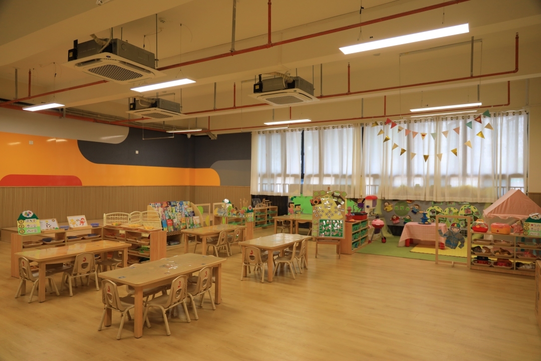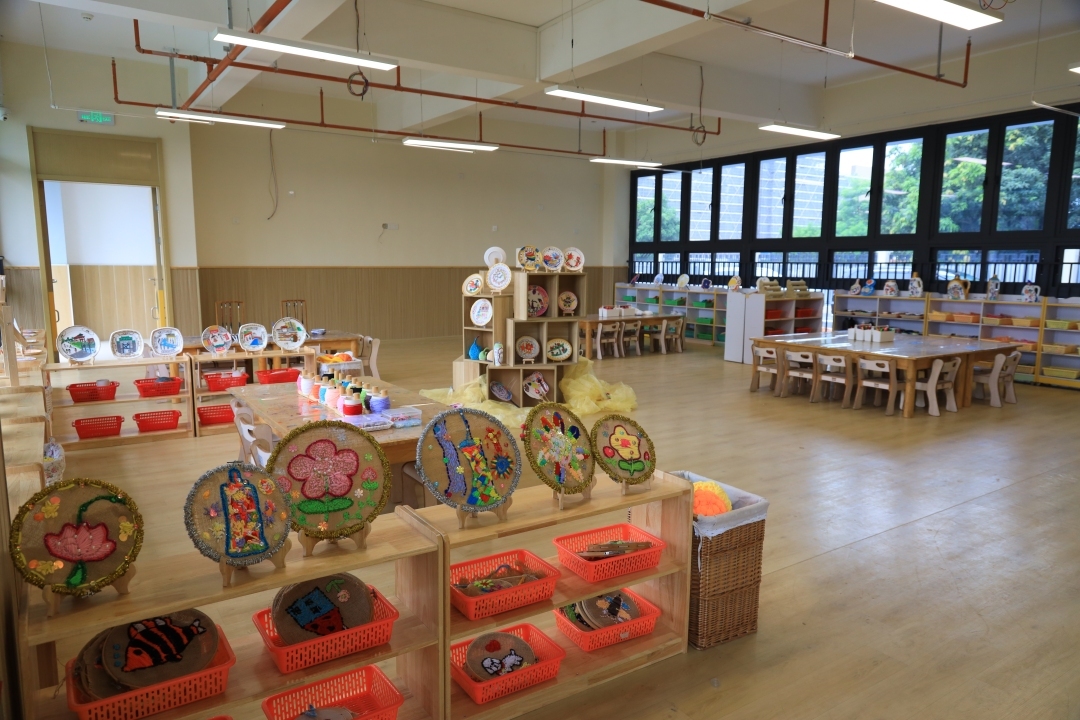 河沙园区拥有独立完整的现代化园舍,占地约6000平方米,建筑面积约6455平方米,户外活动场地约1799平方米,办学规模由原先9个班扩至18个班,设有美术创意坊、绘本阅读坊、音乐综合室等多元功能室,室内外空间灵动温馨,为幼儿们的兴趣探索、潜能发掘和个性化发展提供了无限可能。