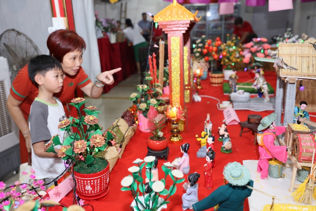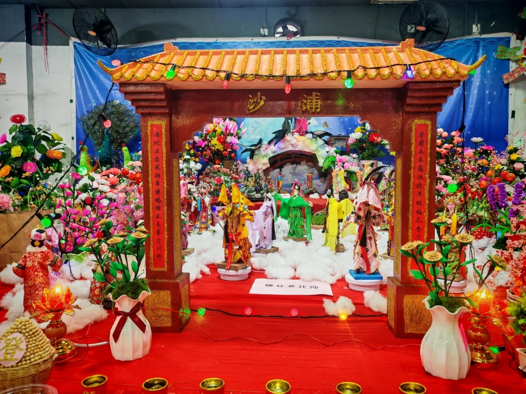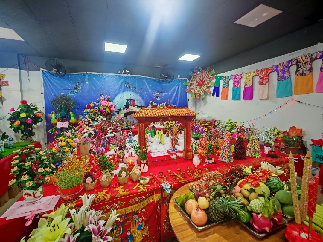 往年,6个乞巧组会在双岗和沙浦的祠堂“摆七娘”。近年来,随着双沙旧村改造的推进,巧姐们一如既往地保持传承乞巧文化、制作乞巧的初心,选择在临时安置区“摆七娘”。走进展厅,贡台上陈列着五谷丰登、斋塔、鹊桥景观等一件件匠心独具的创作,绚丽的颜色抢眼夺目。