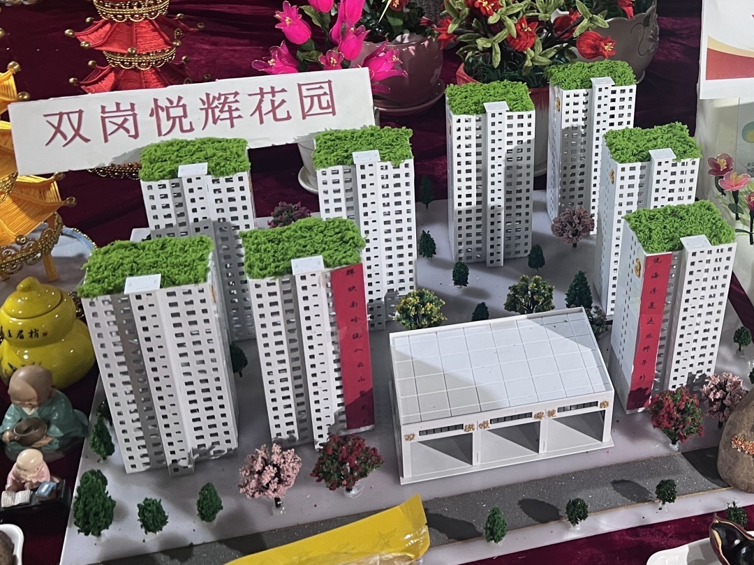 今年,巧姐们创作了一系列反映时代变迁的作品,其中引人注目的是《悦辉花园》,生动再现了居民居住环境从农村到小区的变化。区巧文介绍说:“这个作品是用硬壳纸做的小区模型,因为我们双沙社区今年搬到了崭新的回迁房,村民们乔迁新居过上新生活了。”