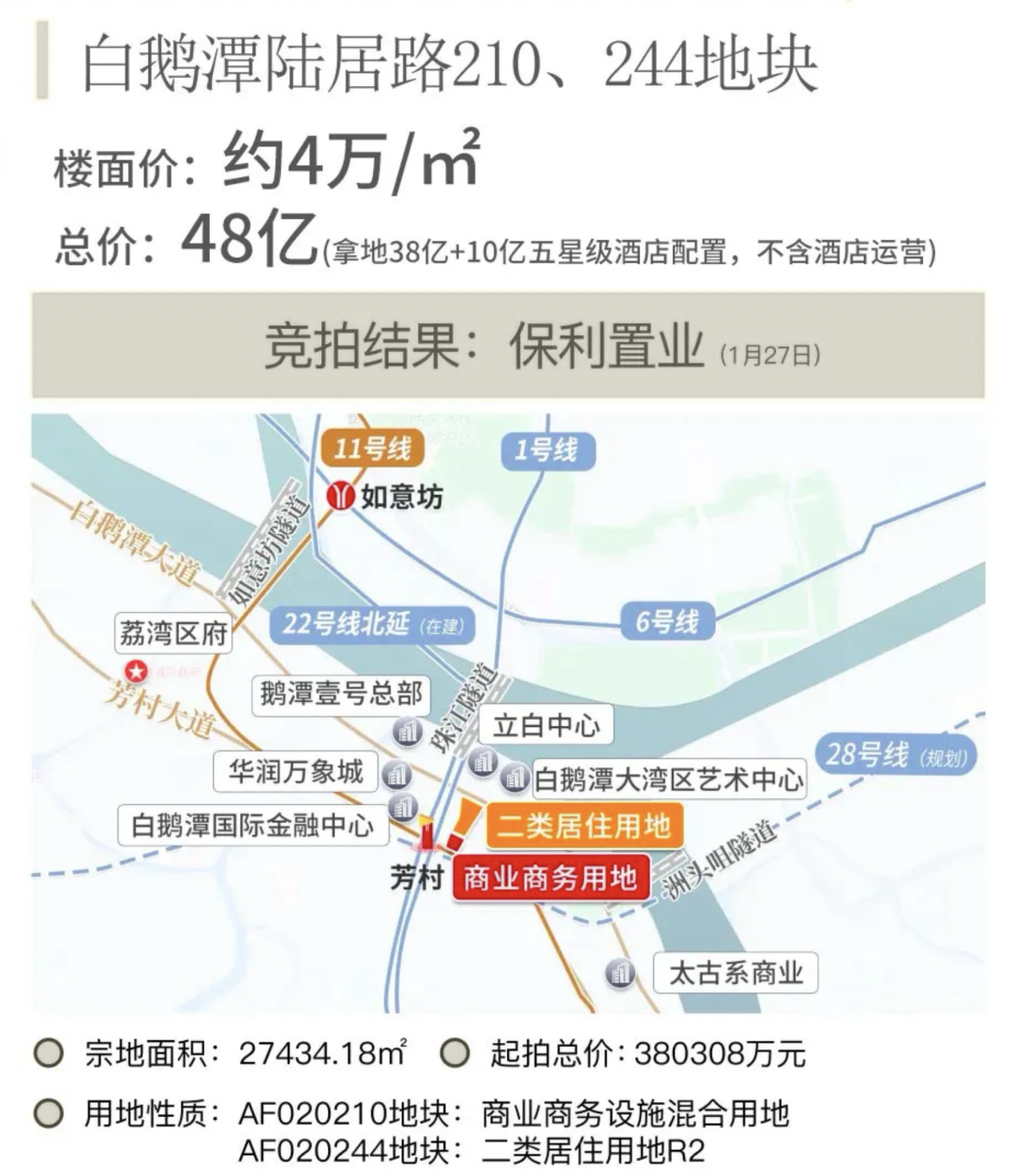 今年1月,保利置业以超38亿元拿下白鹅潭陆居路地块,按照出让条件规定,210地块必须配建五星级酒店。在论坛活动中,保利置业透露,将以超10亿元的投入打造区域内首个万豪系五星级酒店。这不仅将填补板块高端酒店的空白,还将引领白鹅潭国际级生活方式升级。据悉,项目将以“国际酒店+鼎级居所”的复合开发模式,将城市发展战略、岭南文化传承与现代人居理念相融合。设计上特邀了专注于五星级酒店设计、曾荣膺室内设计最高荣誉“Gold Key Awards”的CCD郑中设计事务所,深入探索广州十三行在地文化和精神图腾,以超地域文化表达演绎广府文化新生,并融入骑楼柱廊、博古架、满洲窗等设计。