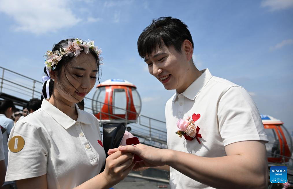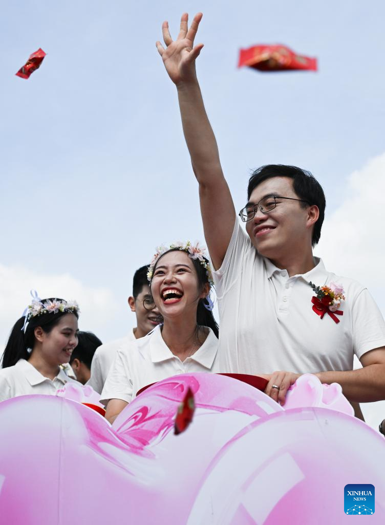 Couples participate in a group wedding held at the Canton Tower in Guangzhou, south China's Guangdong Province, Aug. 29, 2025. Fifteen couples participated in a group wedding here on the Qixi Festival, also known Chinese Valentine's Day, which falls on Friday this year. (Xinhua/Deng Hua)