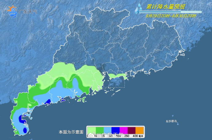 受其影响,30日8时至31日8时,广东西南部沿海、广西南部沿海、海南岛南部有大到暴雨(50-90毫米)。