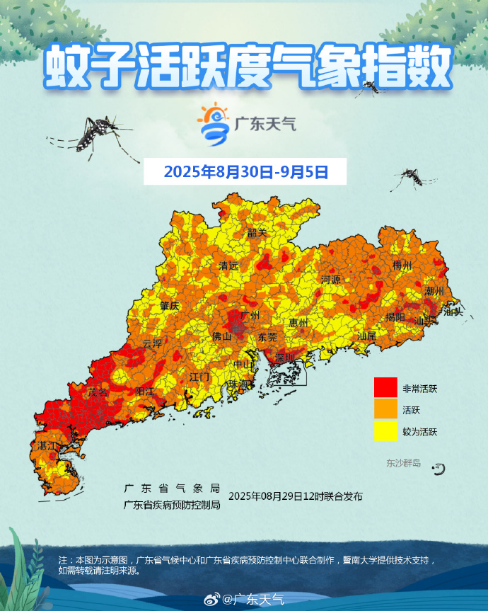 根据广东省气象局、广东省疾病预防控制局8月29日14时联合发布广东蚊子活跃度气象指数,预计未来一周(8月30日-9月5日),粤西中部、珠江三角洲中南部、粤东中部、云浮西部、梅州南部市县人口密集区蚊子非常活跃。
