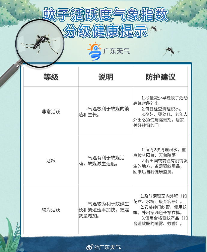 值得注意的是,气温变化影响蚊子活跃度,尤其在早上7时至9时和傍晚17时至19时为伊蚊活动高峰,请做好防护措施,谨防蚊虫侵扰。