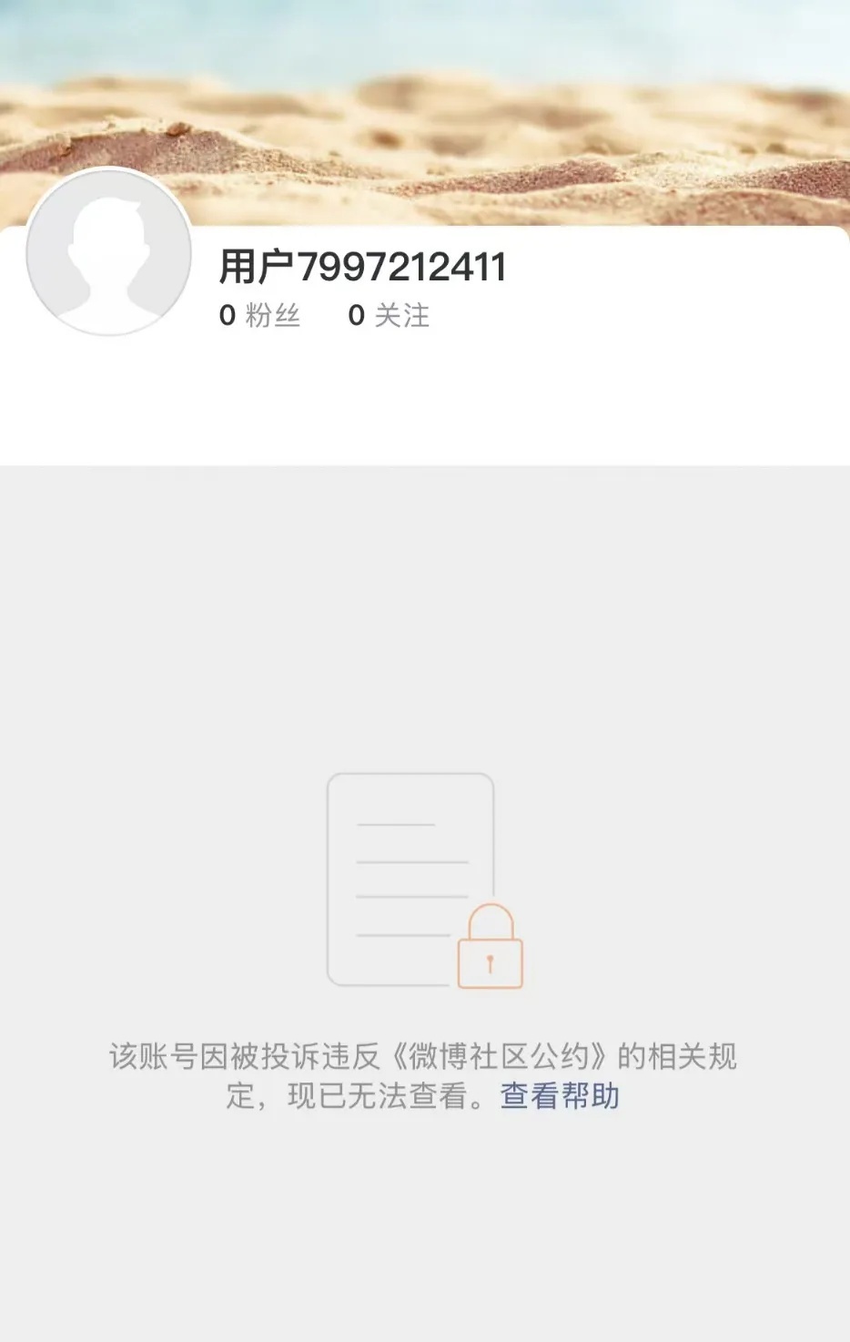 页面显示,“该账号因被投诉违反《微博社区公约》的相关规定,现已无法查看”。