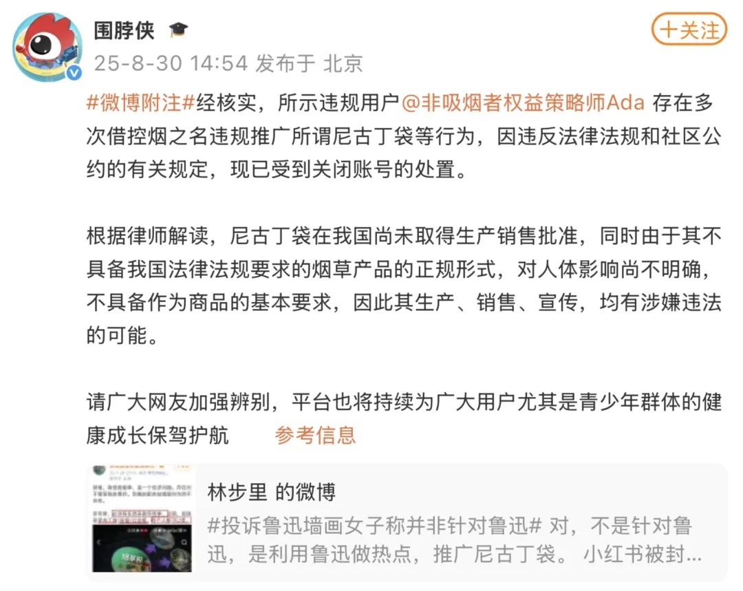 8月30日下午,微博社区观察员官方账号@围脖侠发文称,经核实,所示违规用户@非吸烟者权益策略师Ada 存在多次借控烟之名违规推广所谓尼古丁袋等行为,因违反法律法规和社区公约的有关规定,现已受到关闭账号的处置。