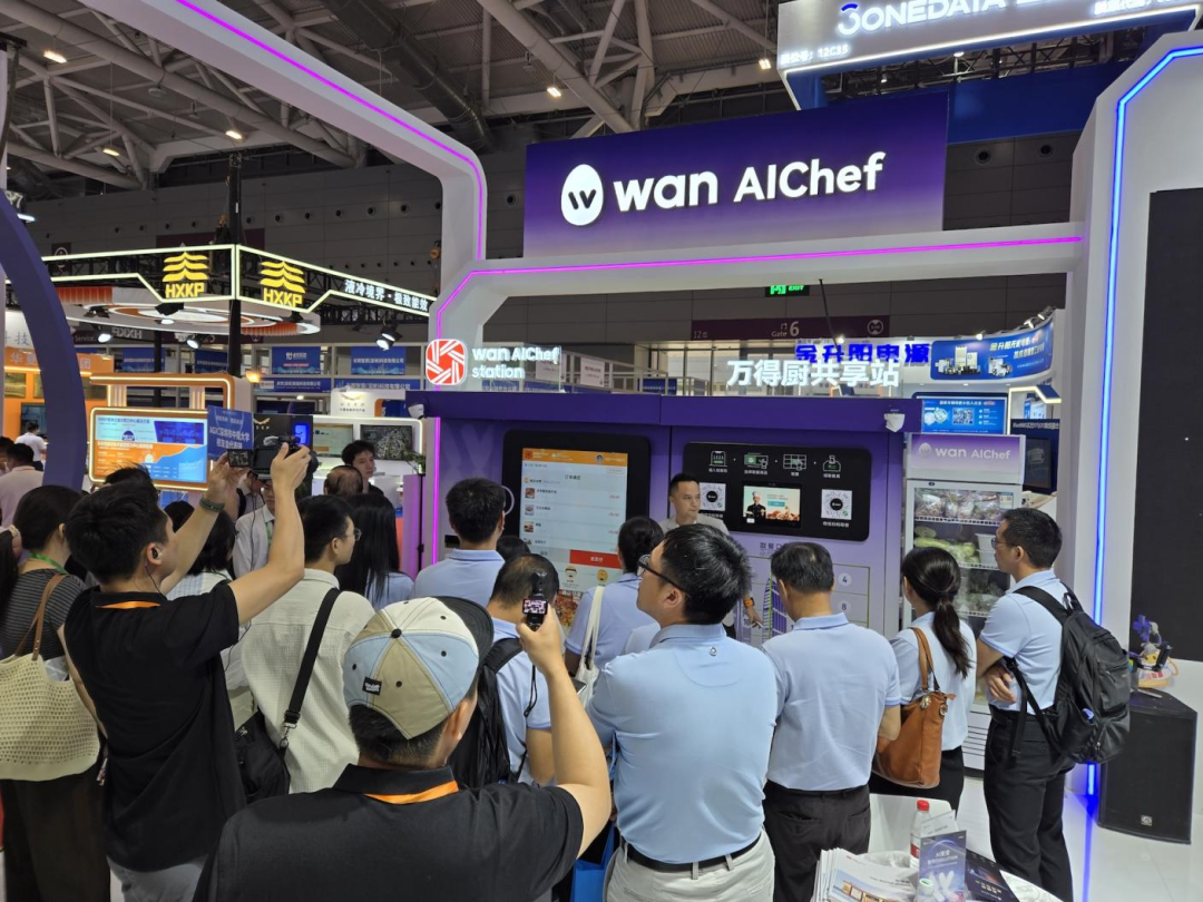 在现场万得厨产品展示区,围观人群更是挤满了展台:有人踮脚观察家用烹饪智能体如何“秒识”食材,有人围着酷似快递柜的共享站模型追问使用流程,还有观众排队体验“扫脸定制健康食谱”功能。