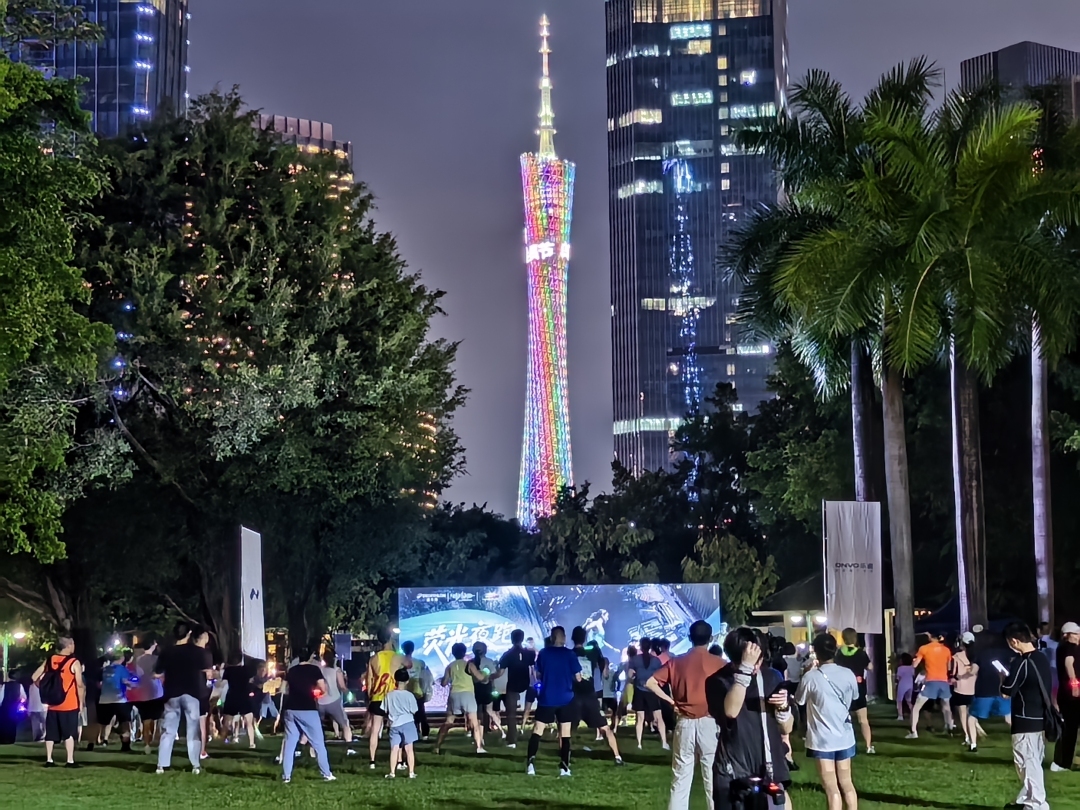 珠江公园作为广州中心城区的重要公共绿地,见证了无数市民的夜跑与健身日常。伴随着清脆的鸣笛声,参与活动的运动爱好者们佩戴荧光手环、挥舞荧光棒,从珠江公园舞台广场出发活力开跑。流动的光带在夜幕下闪耀,宛如一条跃动的光河,为广州的夜晚增添亮丽而充满动感的风景线,成为城市夜间活力的生动写照。