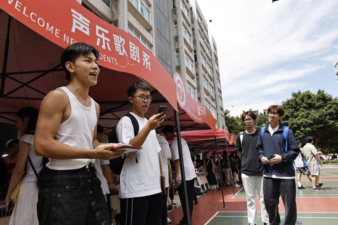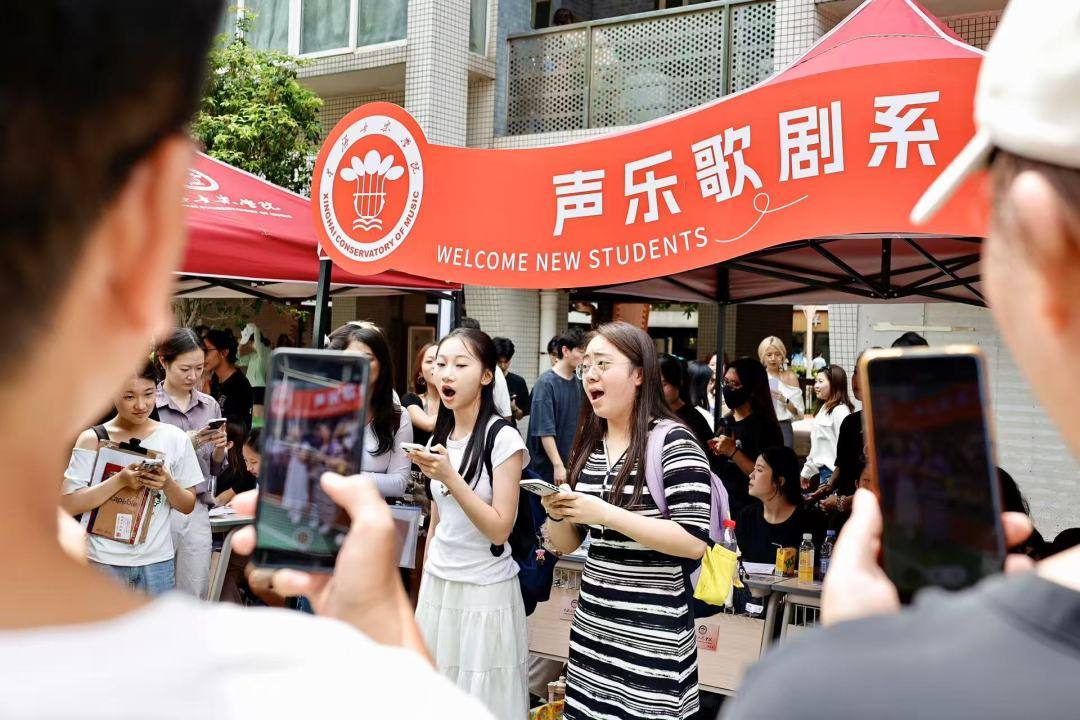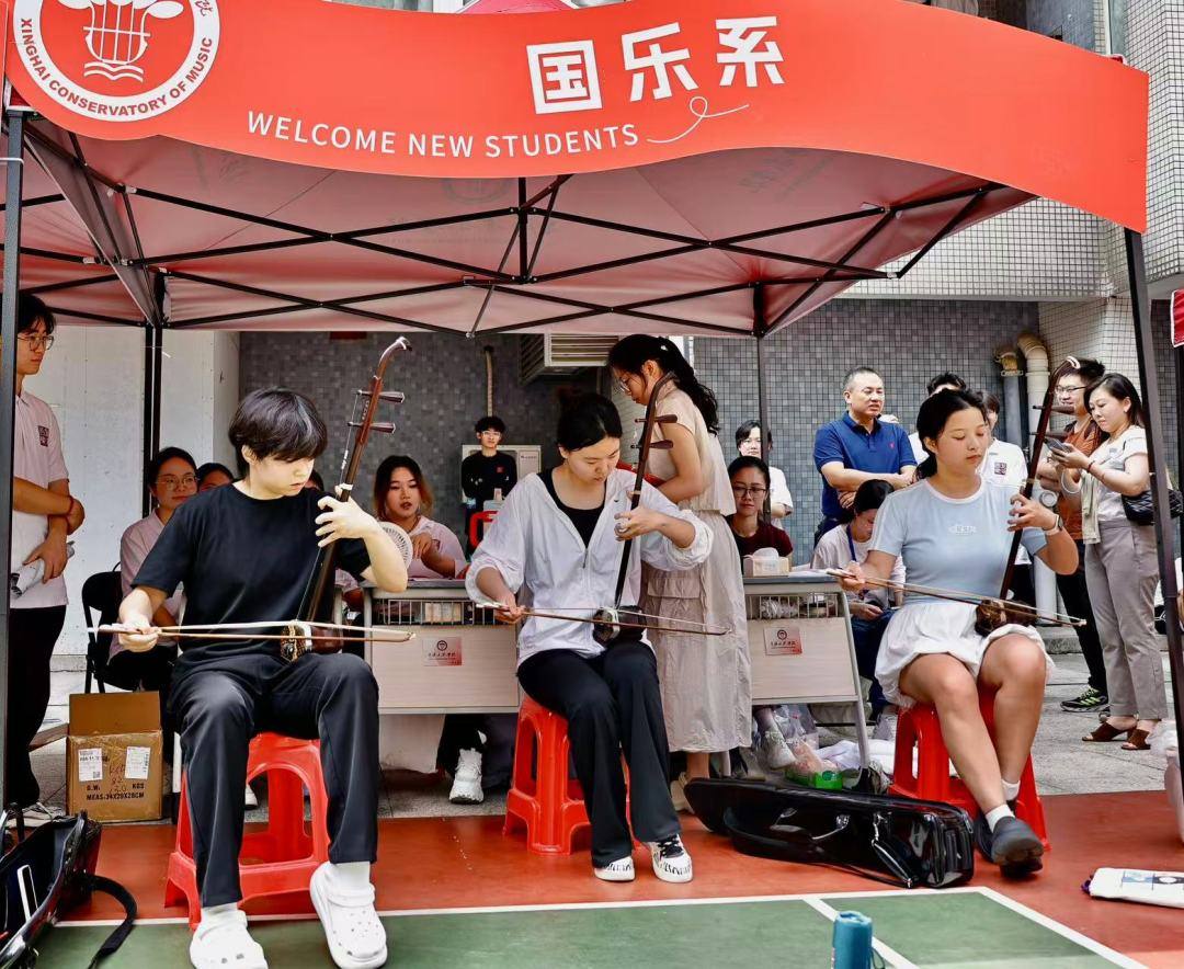 迎新现场,宛如一个演出现场。在一棵榕树下,一位女生正弹奏着琵琶《十面埋伏》,不远处,一位男生则吹奏着萨克斯。国乐系的迎新摊位前,三位同学演奏的二胡名曲《赛马》气势磅礴,一曲终了,众人纷纷鼓掌喝彩。旁边的声乐歌剧系和民族声乐系也“不甘示弱”,前来报到的新生纷纷一展歌喉,从音乐剧《虎门销烟》的选段,到音乐剧《金沙》中的《天边外》,一首首歌曲轮番上演,让人应接不暇。