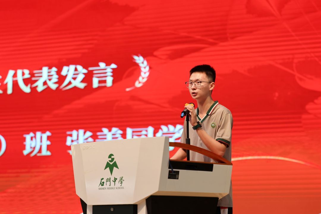 开学典礼上,学校对上一学期表现优异的集体与个人进行了表彰,激励全体同学见贤思齐、奋发向上。随后,高三(6)班张姜同学作为学生代表发言。他表达了石门学子对新学期的憧憬与决心,立志要继承和发扬伟大的爱国主义精神,勤学笃行,追求卓越。高三年级主任陈琦老师作为教师代表寄语全体同学,希望同学们珍惜时光,勇担重任,以智慧和汗水书写青春无悔的篇章。