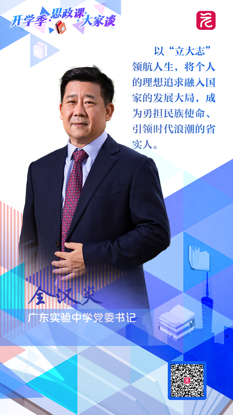 在广东实验中学开学典礼上,广东实验中学党委书记全汉炎开讲思政第一课,鼓励省实学子铭记先辈荣光,以“明大德”涵养品格,以“立大志”领航人生,将个人的理想追求融入国家的发展大局之中,成为勇担民族使命、引领时代浪潮的省实人。