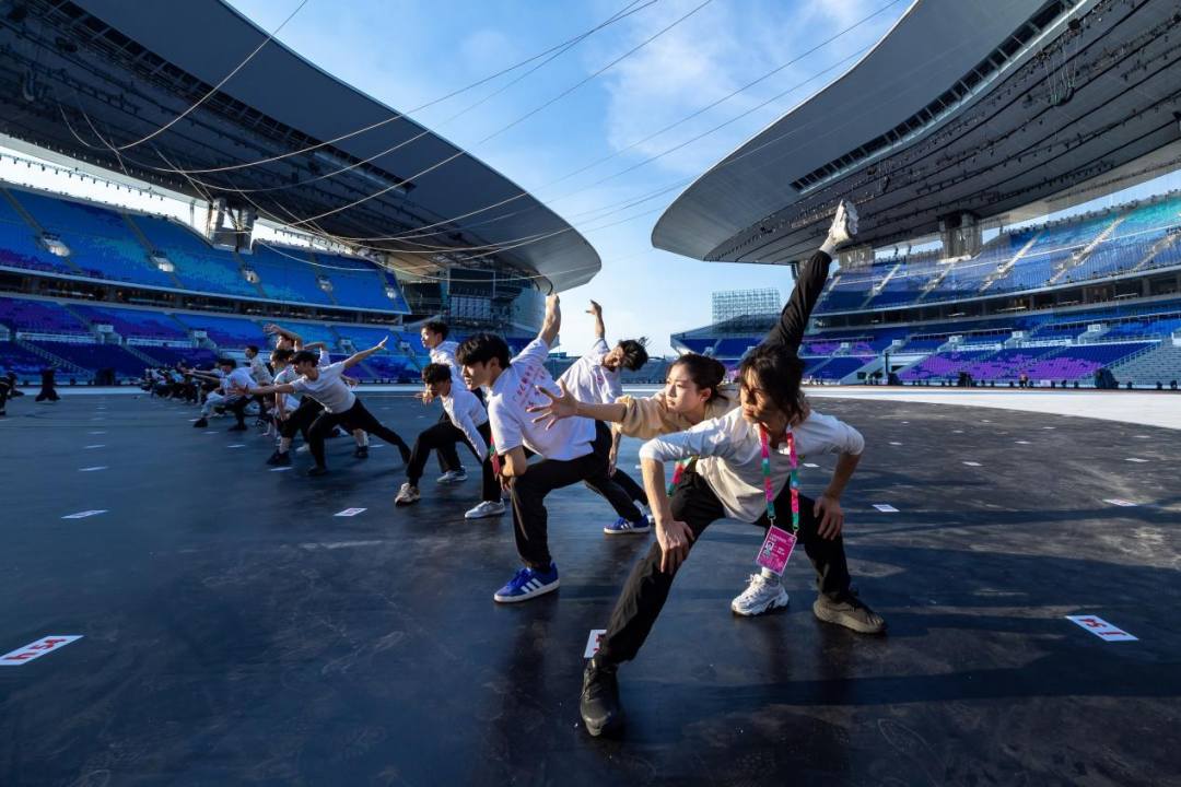 当日下午,数百名演员精神饱满、列队有序进入场馆,迅速投入场内排练。他们当中八成来自粤港澳大湾区多所高校。从下午3时至深夜11时30分,演员们聚焦于文体表演的分篇章内容,反复调整队形走位,与场地、音乐等进行多维协同。