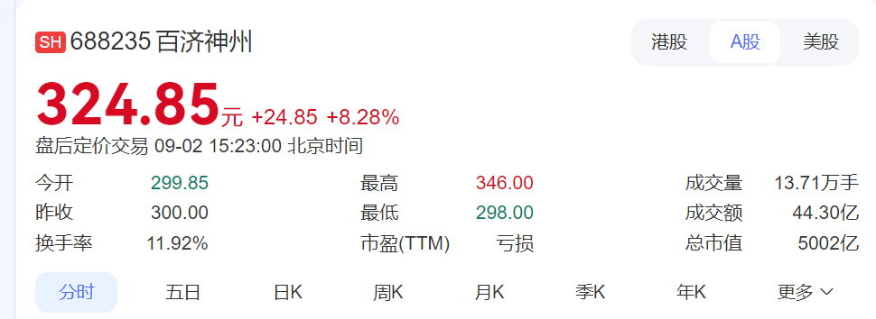 9月2日,百济神州A股市值创新高。截至收盘,百济神州股价为324.85元,股价上涨8.28%,公司总市值达到5002亿元。据悉,这也是百济神州A股市值首次突破五千亿元。当天,创新药概念再度走强。长春高新2连板,盟科药业股价上涨8.12%,迈威生物、贝达药业、三生国健等纷纷跟涨。